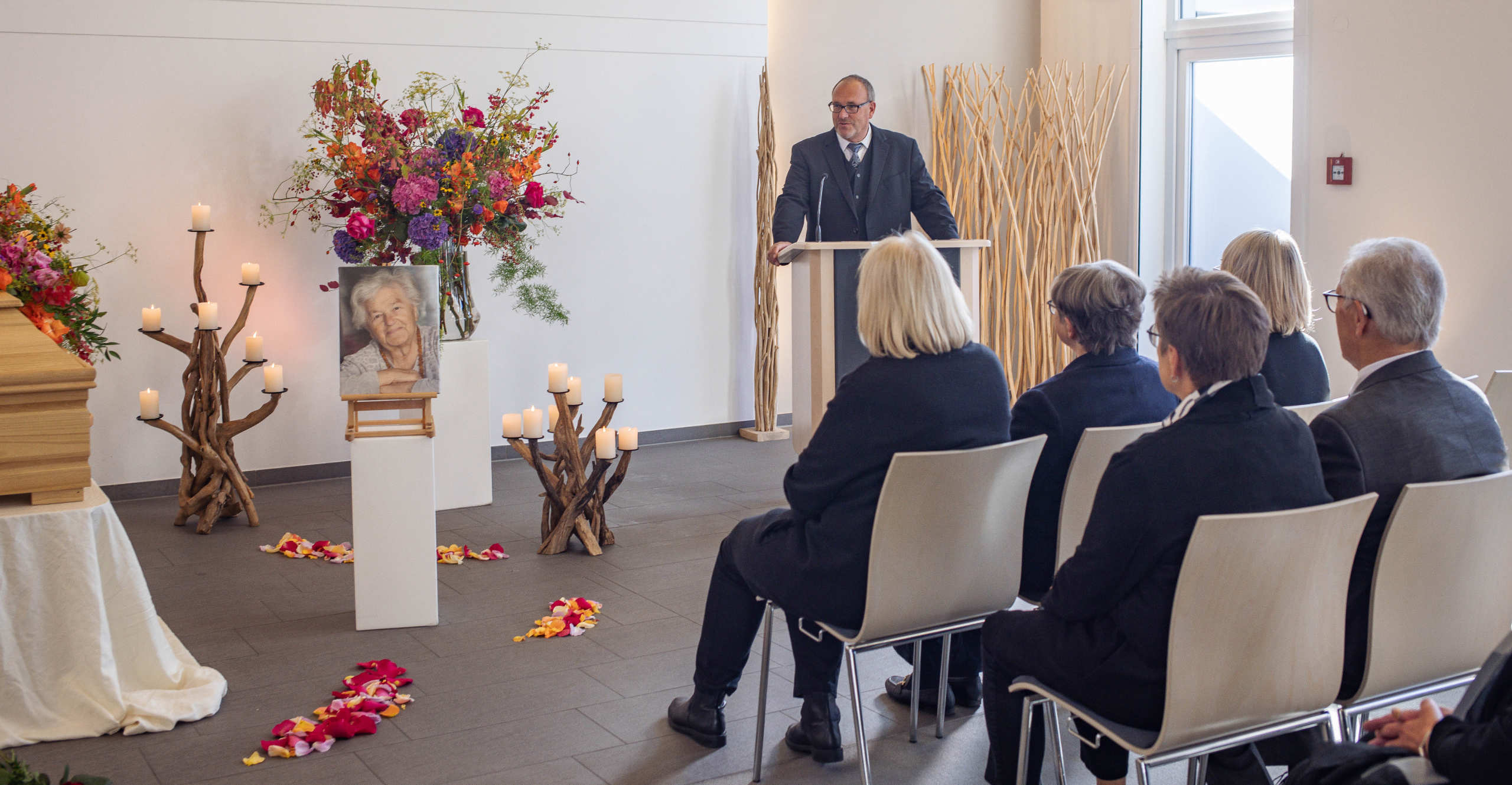 Gibt es ein besonderes Erinnerungsstück? Ein Möbelstück des Verstorbenen oder ein Instrument? Vielleicht hatte er ein außergewöhnliches Hobby? Gerne beziehen wir diese Gegenstände in die Dekoration mit ein. Stilvolle Leuchter sowie Blumen und Kränze sorgen für den feierlichen Rahmen.